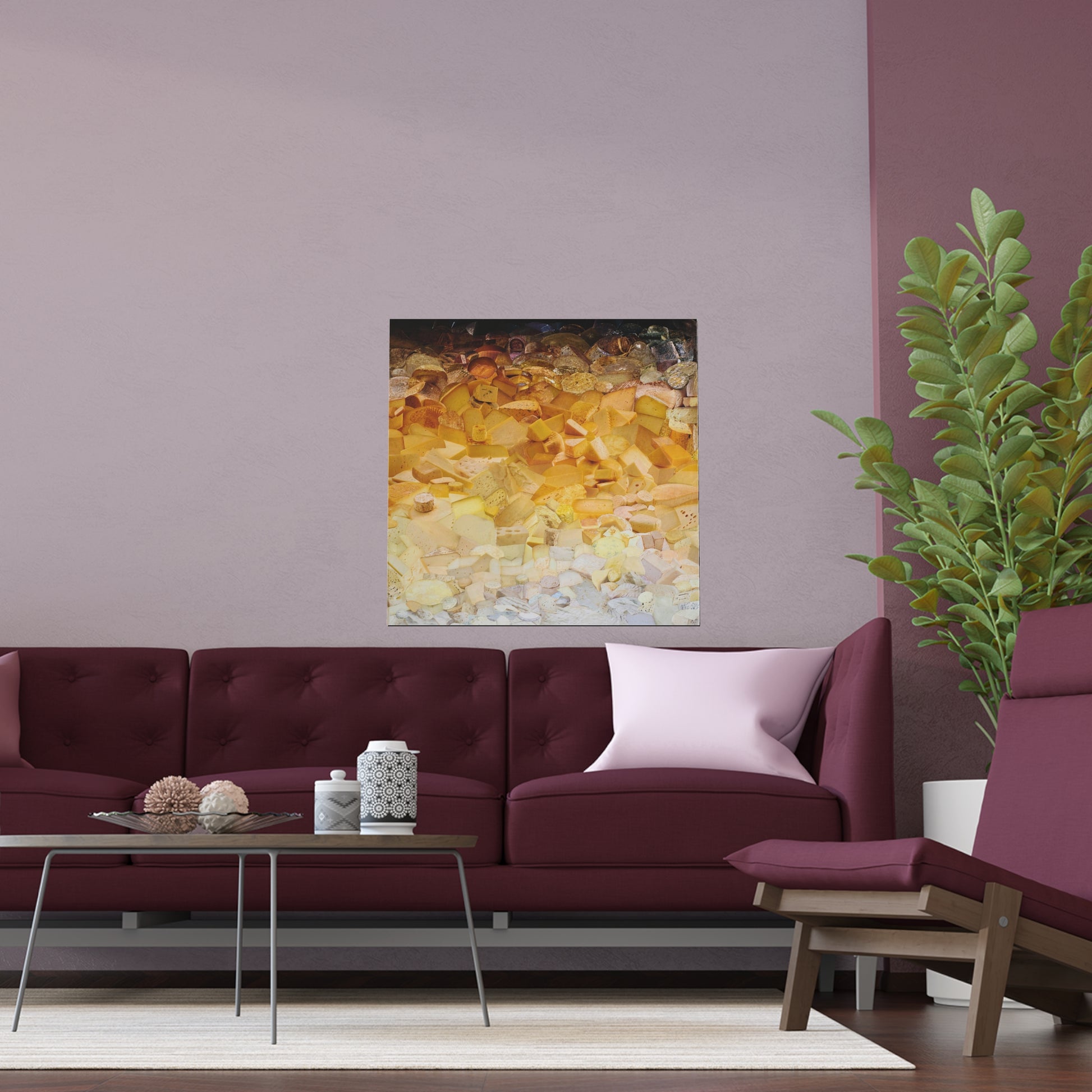 Silk-finish poster that brings a warm, textured glow to any wall. Printed with high‑quality Mimaki UV inks on heavyweight 200 gsm semi-gloss paper, the image holds crisp detail and richly layered golds and ambers. The waterproof and scratch‑resistant surface lets you display it in sunlit living rooms, covered patios, or cozy bedrooms without worrying about fading or light splashes. Mounted on EUTR‑compliant woodstock, it comes in multiple orientations and sizes so you can choose the scale that best anchors your space. It feels like a quiet, sunlit pile of found objects—textural, intimate, and quietly luminous—ready to settle into a shelf niche or above a bedside table.
